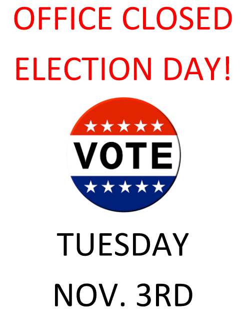 Closed For Election Day October 29, 2020 by admin in Notices The office will be closed on Election Day, November 3rd. Please VOTE!