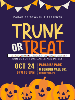 This years Trunk or Treat will be held Oct. 24th from 6pm to 8pm at Paradise Park, located at 6 London Vale Dr., Gordonville, PA